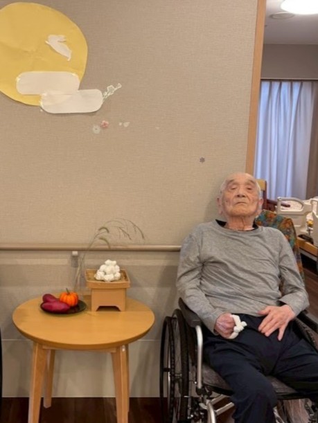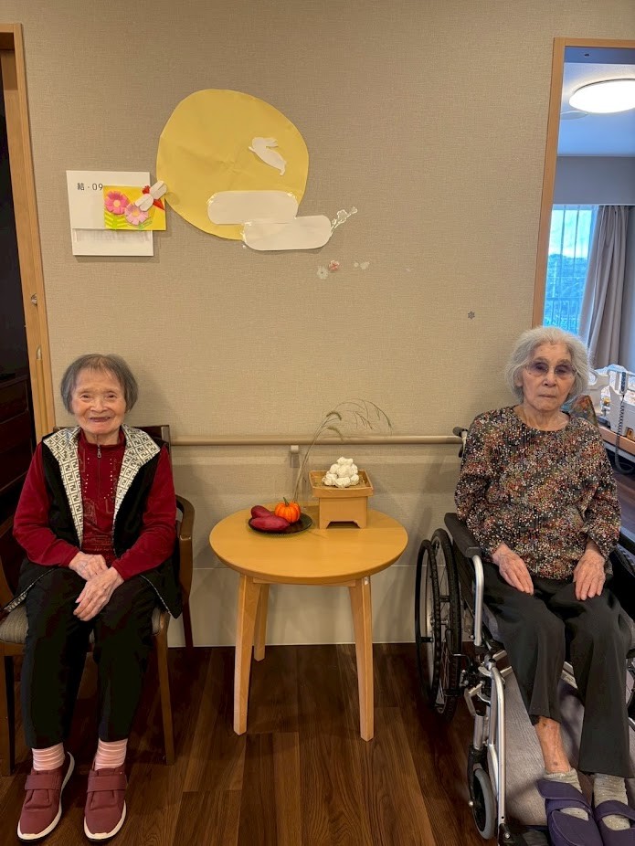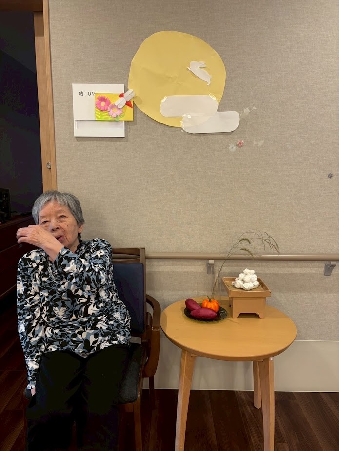 壁にはまんまるのお月さまを飾り、その前にカボチャやおいも、お団子などを並べました。ご入所者様にも紙を丸めてお団子を作るなど、飾りつけのお手伝いをしていただきました。