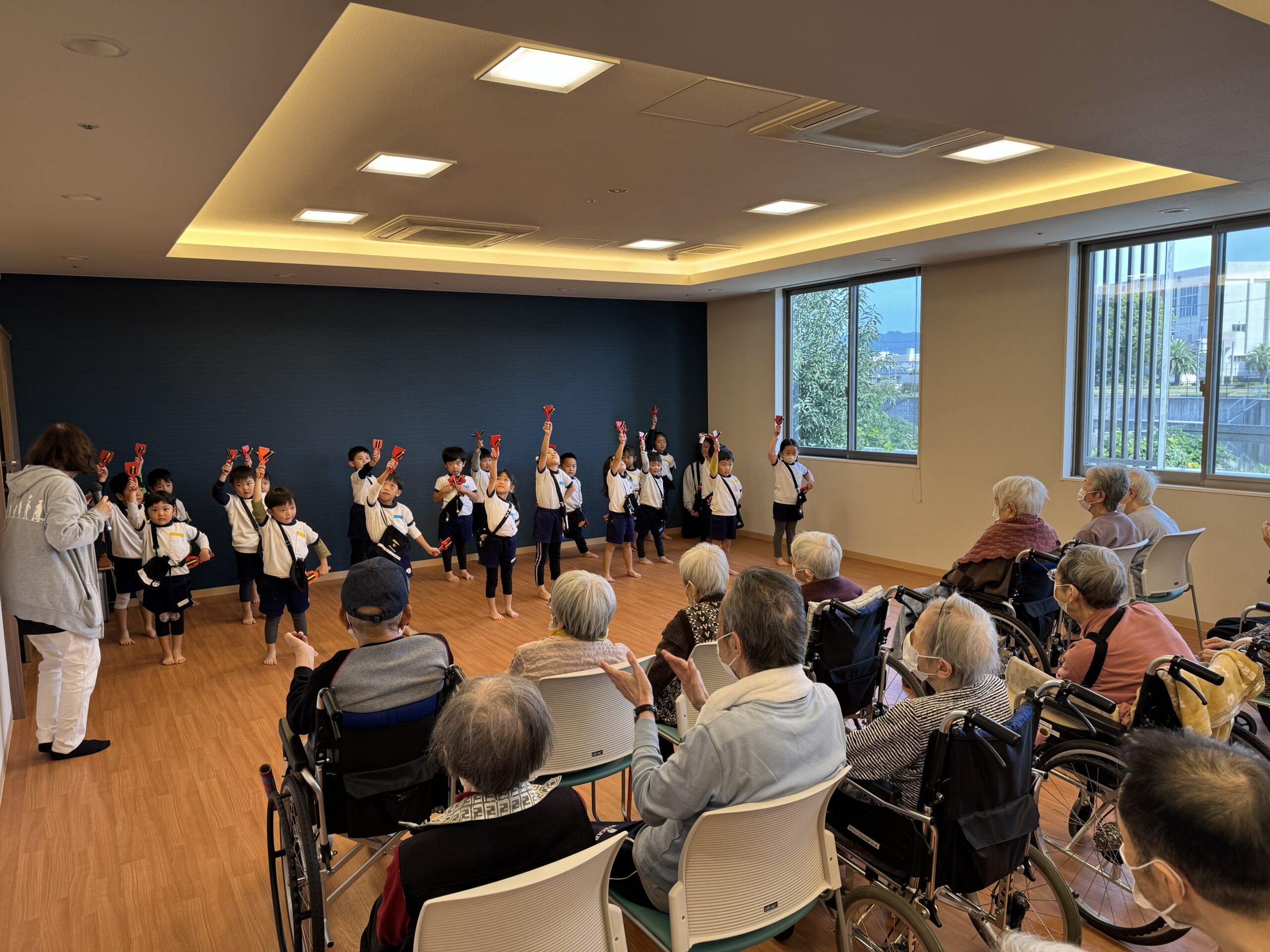 今月、粕屋町で開催された「第23回YOSAKOIかすや祭り」で披露されたよさこいを、入所者の皆さまにも元気いっぱいに披露してくれました。