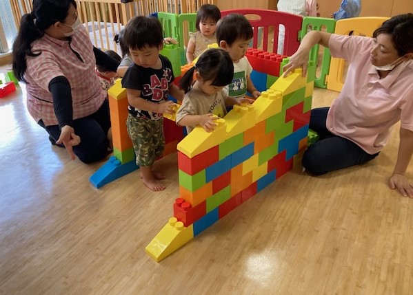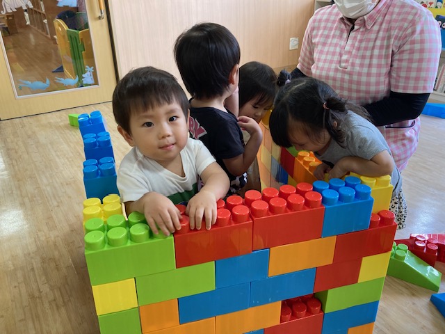 大型ブロックで作った家や乗り物で楽しそうに遊んでいますね(*^_^*)
