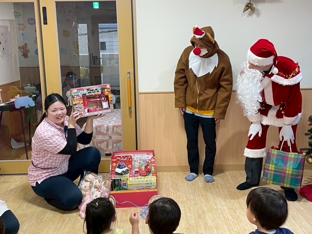 誕生会の後は、いよいよみんなが楽しみにしているクリスマス会☆そり一杯のおもちゃと一緒に、サンタさんとトナカイさん登場☺
