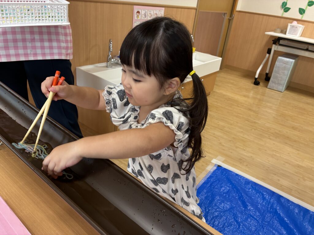 らいおんぐみさんは、おはしでそうめんに見立てた毛糸に挑戦!!