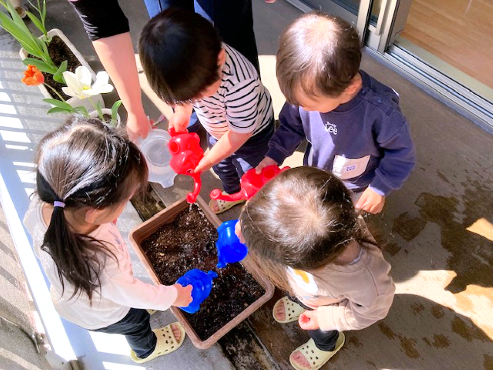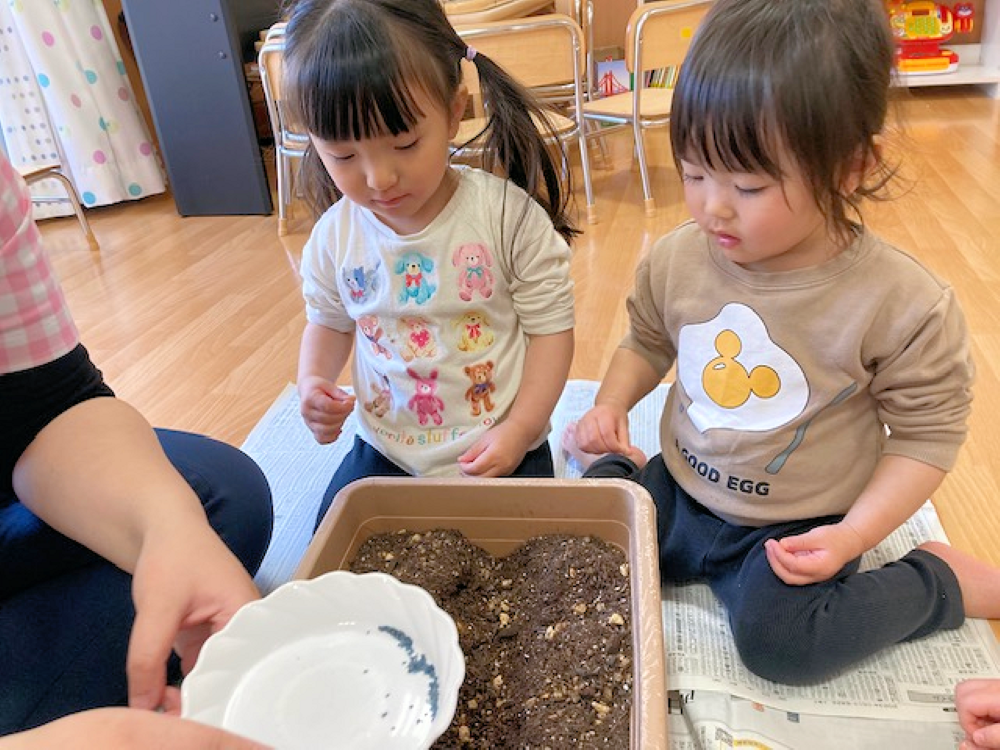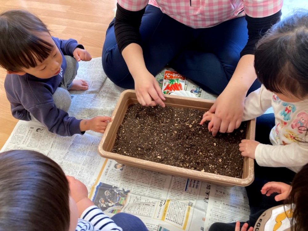 「みんな 土のお布団を上手にかけました~」 「おおきくな~れ」