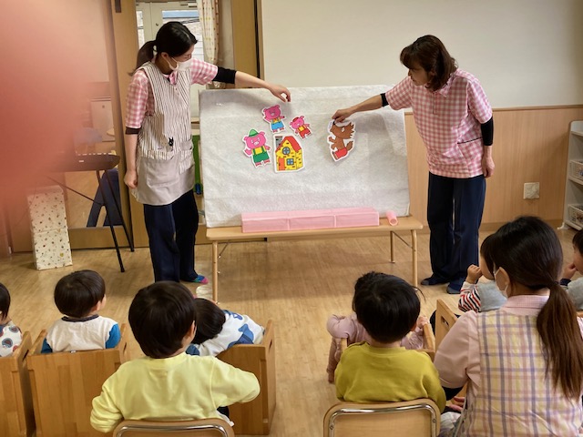 先生からのプレゼントは「3びきのこぶた」のパネルシアター!